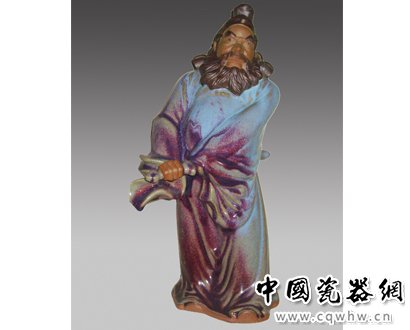 今天我们要介绍的瓷器是钟馗像,钟馗依山石而坐,头戴黑色软冠,身穿朱彩描金海水云龙纹蟒袍,腰系黄色丝带,足蹬白底黑靴。他左臂倚着一仿宋官窑酒坛,右手持杯,两眼微闭,醉意朦胧,自得其乐,背后有一红蝠纹瓶。山石后侧刻阴文 “康熙年制”四字楷书款。人物生动传神,釉彩浓淡相宜,华美自然。