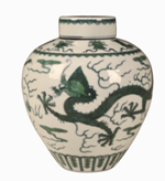另有一件清乾隆款白地青花绿龙纹盖罐(图3),高21厘米,口径6.5厘米,底径8厘米;盖面平坦;罐直口,短颈,溜肩,圈足;全器以白釉为地,青花勾 边填以绿彩,肩部绘八宝纹,腹部绘龙纹,近底部绘莲瓣纹;底部有“大清乾隆年制”三行篆书官窑款。此器用于贮存茶叶。此器绿釉近似明代成化、弘治时绿彩器的色调。其纹饰先以青花绘出,再填以绿彩,色泽明艳,清新悦目。此种装饰的盖罐,康熙时已有,但器型较小,乾隆时制较多,并延续至道光时期。民国时后仿的 绿彩龙纹罐,器型笨拙,胎体厚重。