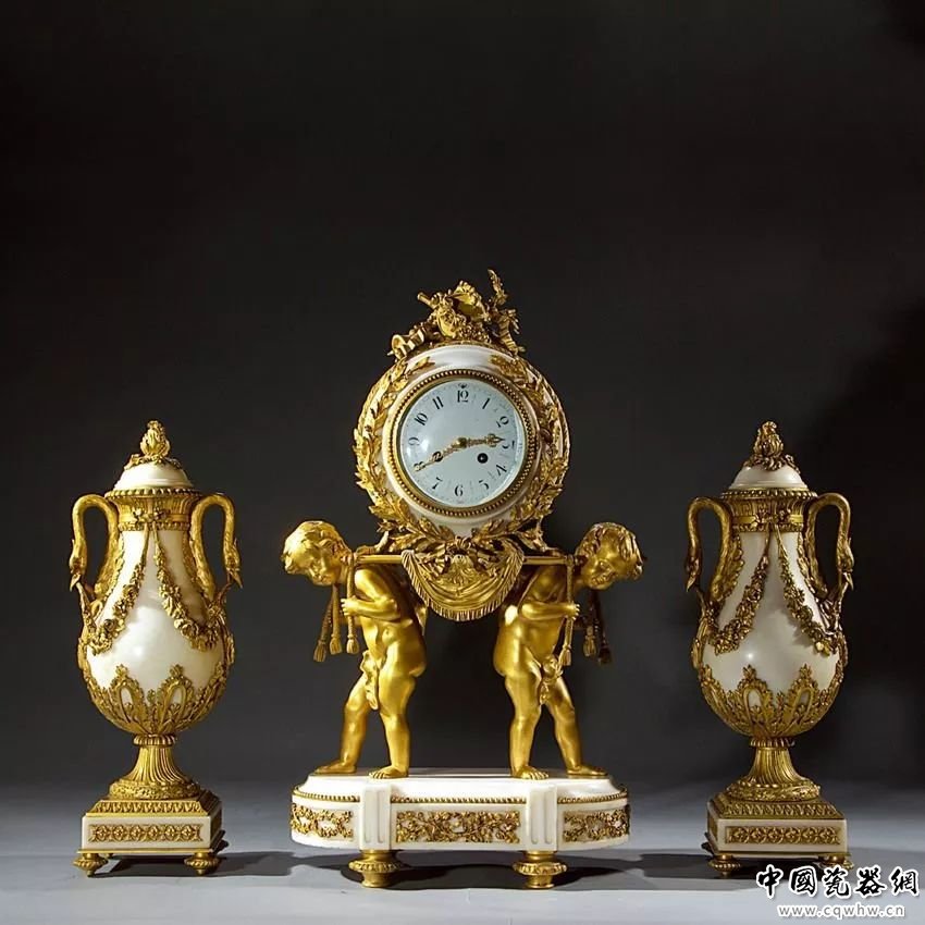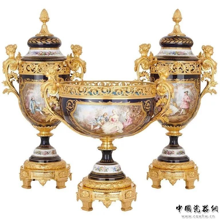 塞夫尔时钟与配饰套装是该公司在19世纪推出的摆饰。它通常由三件物品组成:一个时钟,配上一对瓮,或者是三件具有相似装饰主题的器皿。