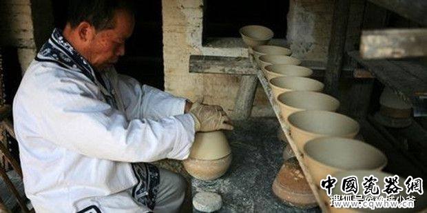 印坯:印模的外形是按坯体内形弧线旋削而成的,将晾至半干的坯覆在模种上,均匀按拍坯体外壁,然后脱模