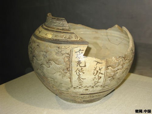1983年,吉州窑永和窑址出土一件丁未年款釉下彩绘水波纹残罐,现藏江西省吉安县文物管理所。底径12.8厘米,高20厘米。敛口,平沿,短颈,溜肩,球腹,圈足,口及上腹部分残缺。罐外壁薄施一层白釉,器内无釉,有明显的旋削纹,足边露砂胎。罐体以褐彩绘画,共有4组纹饰,各组纹饰之间以粗细弦纹间隔,颈部饰卷草纹一周;肩部褐彩书写“□□作称心买卖答者,丁未岁下市朱有成用工”;腹部绘主题纹饰水波纹,中间有一个竖长方形开光,书“□入敬神会,永充供养者”,开光上部绘以荷叶,下部托以莲花,布局与宋元时期荷幡形落款相同;下腹部饰以卷草纹一周。南宋淳熙十四年(1187年)、淳祐七年(1247年)、元大德十一年(1307年)、至正二十七年(1367年)均为丁未年,经考证,南宋孝宗淳熙年釉下彩绘在吉州窑尚未成熟,未见细密繁冗的风格出现;南宋末与元末两个年代,由于战乱,国力衰落,亦可排除;唯元成宗大德十一年的可能性最大。